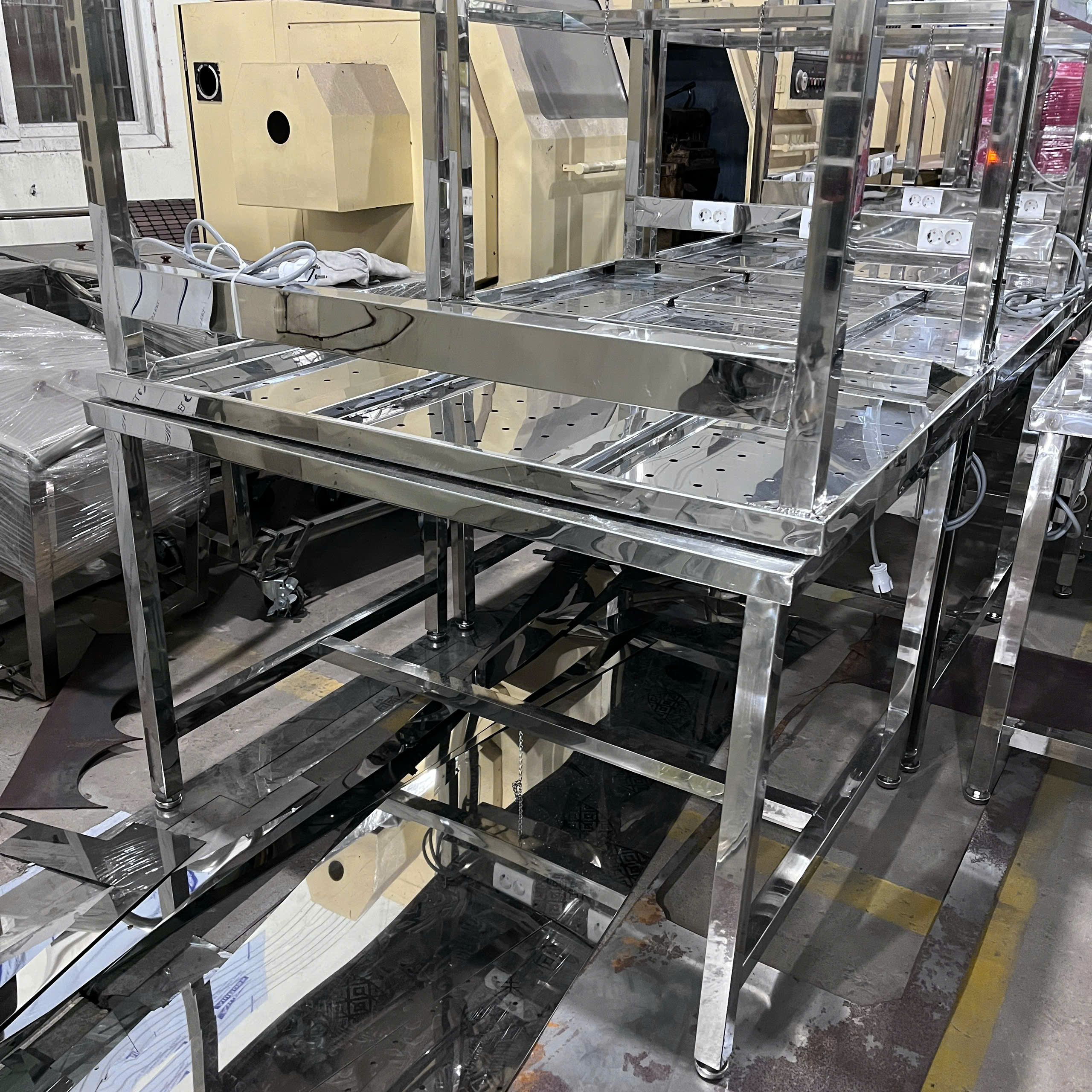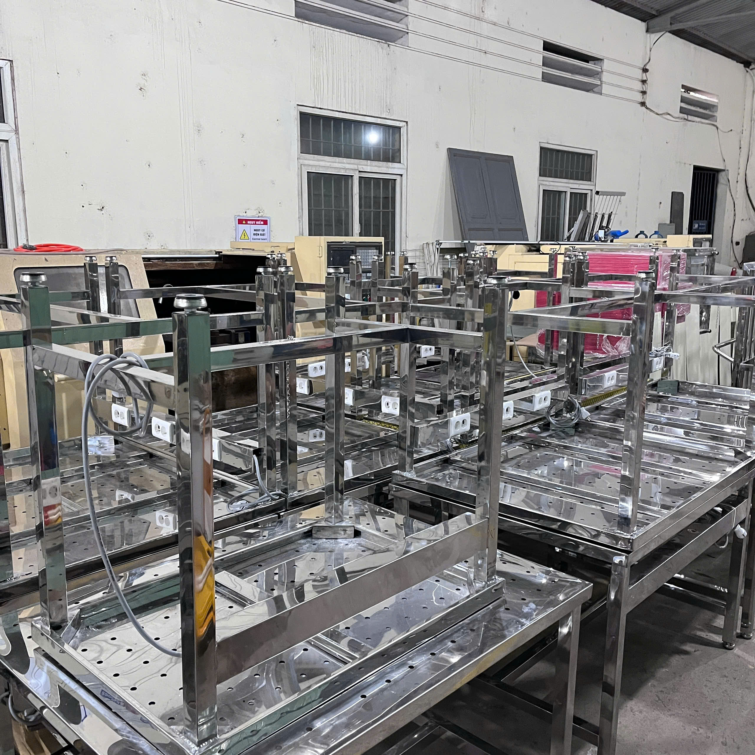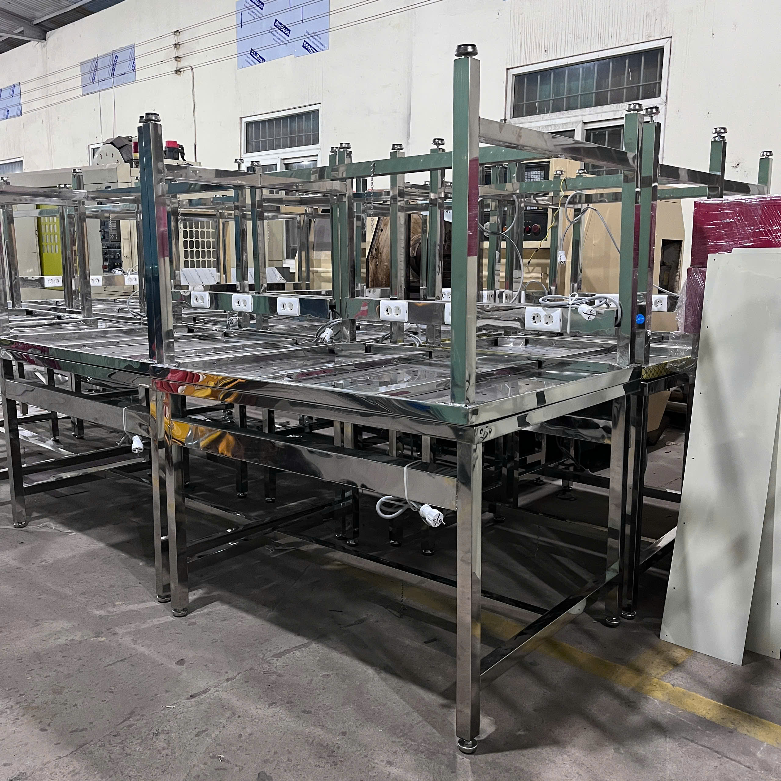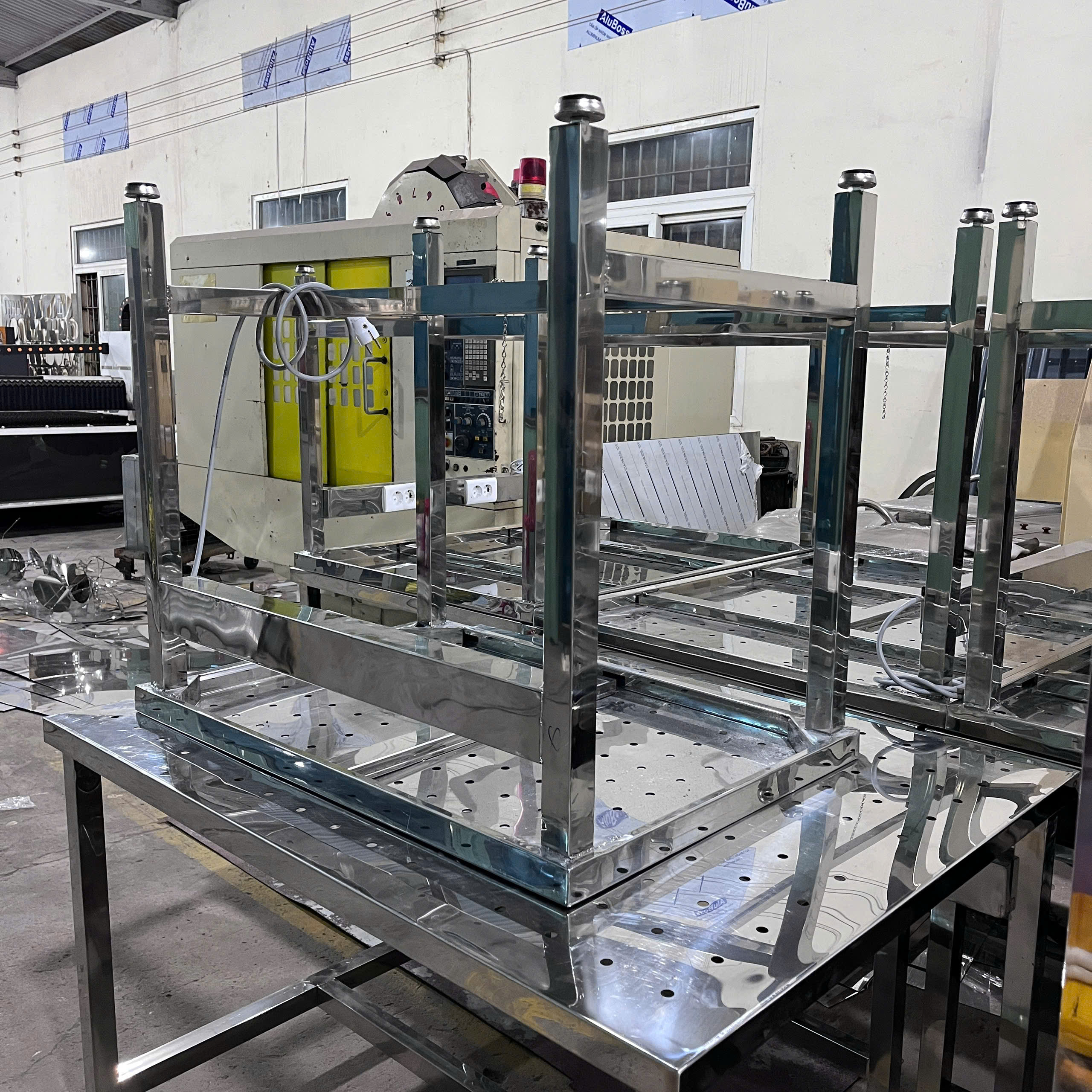 - Khung bàn: Gia công từ ống hoặc hộp inox, được hàn chắc chắn, chịu lực tốt. Bề mặt khung được đánh bóng giúp tăng tính thẩm mỹ và chống gỉ sét.